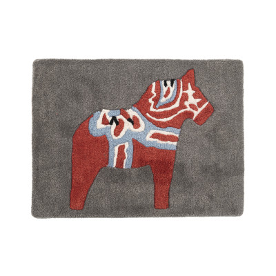 Dalahäst är en handtuftad dörrmatta från svenska Axeco. Mattan är tillverkad i ull och är lämplig för inomhusbruk. Här är Dalahäst i färgen grå.